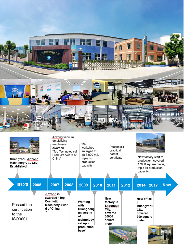 L'IMPRESA di JINZONG è Un'impresa dell'innovazione di tecnologia per integrazione d'integrata di disegno, di fabbricazione e di sistema di macchine & Di impianti cosmetici. Con 20 anni di sviluppo, Jinzong ha filiale di esclusiva proprietà Quattro ed il macchinario Co., srl & Il macchinario il Co., srl di Guangzhou Jinzong del Guangdong Jinzong, che è Nell'ambito della giurisdizione di divisione cosmetica & Di divisione di commercio internazionale, è Responsabile della progettazione delle attrezzature degli insiemi completi, la fabbricazione, la soluzione delle macchine crema cosmetiche di fabbricazione, detersivo liquido di progetto che fa le macchine, prodotti di bellezza che fanno le macchine